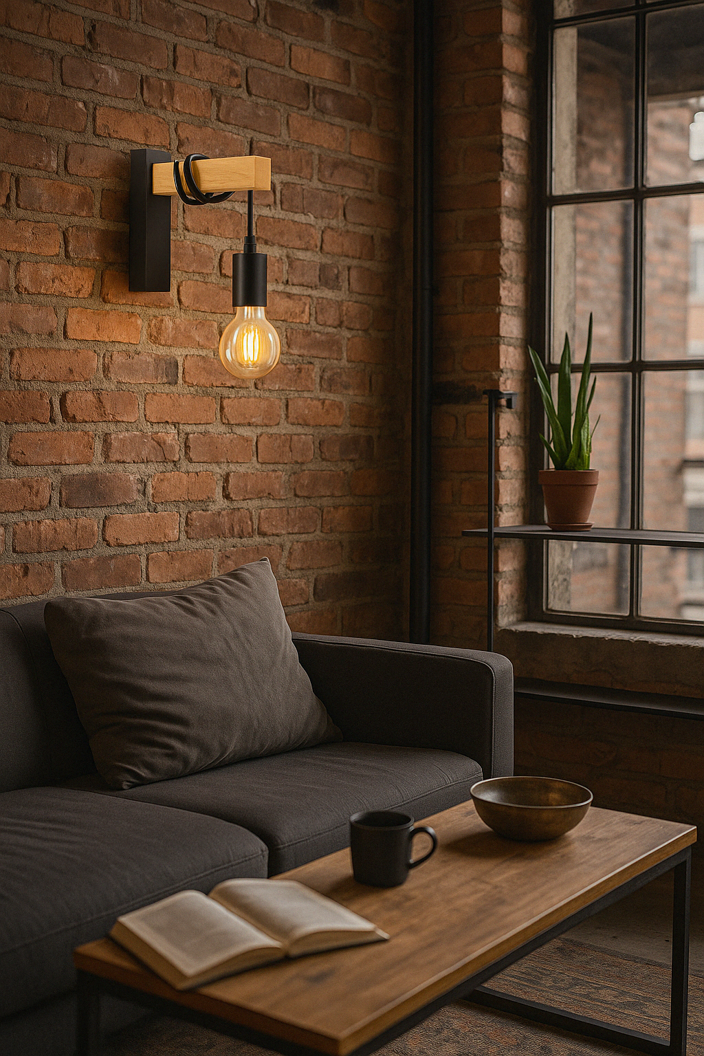 Design industriale moderno; Applique da parete con struttura in metallo nero e dettaglio in legno naturale, perfetta per ambienti dallo stile contemporaneo o rustico.