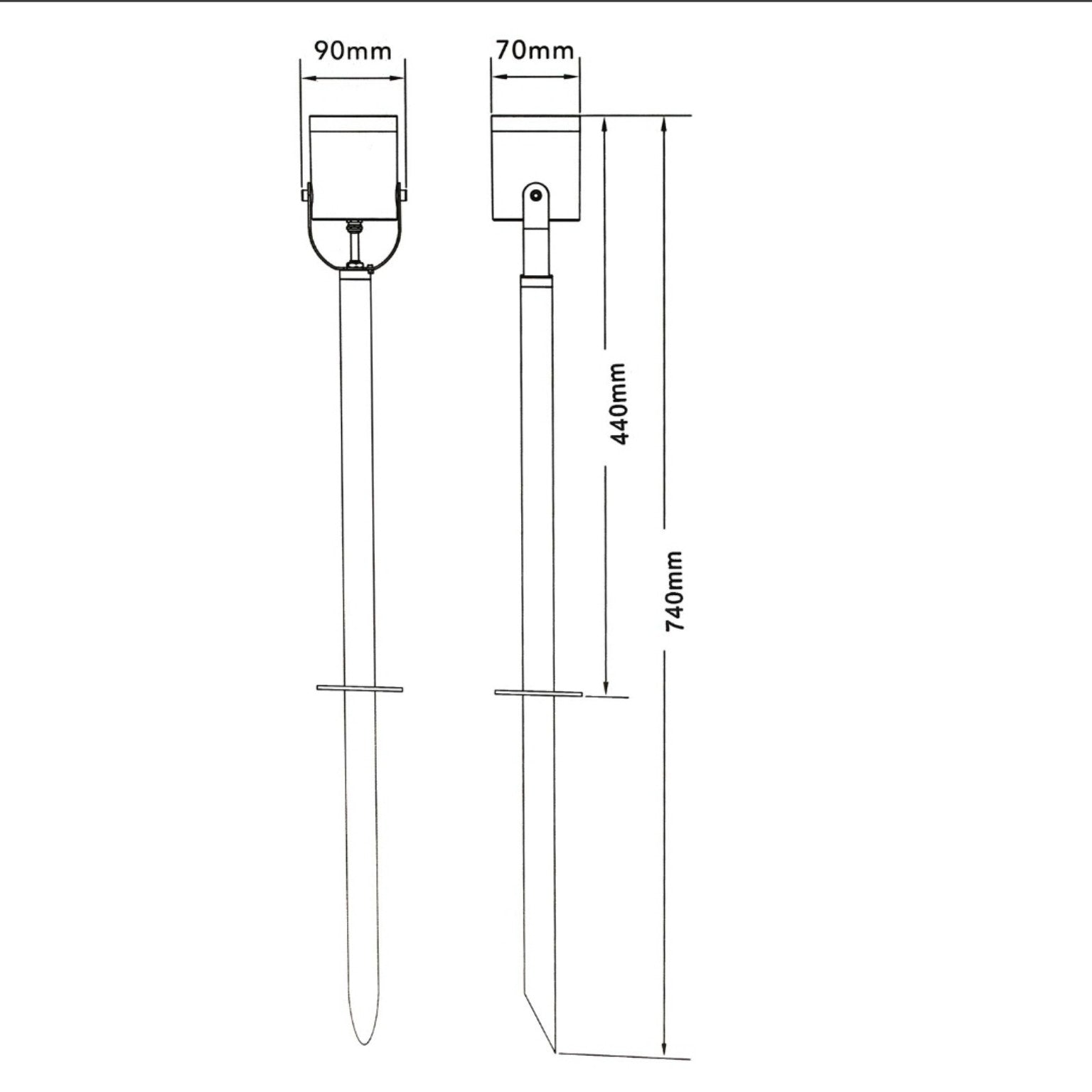 - Installazione semplice e sicura – Picchetto integrato per fissaggio stabile nel terreno; alimentazione diretta 220–240V; dimensioni totali 740 mm, testa Ø70x90 mm