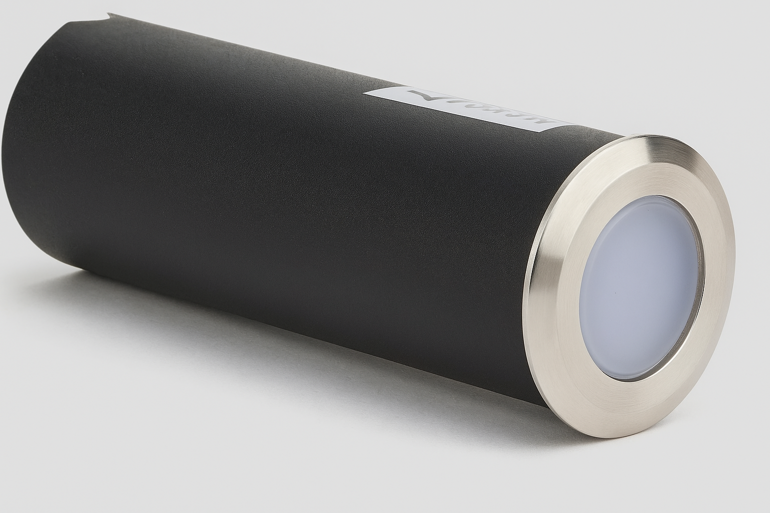 Il corpo compatto (Ø82x26 mm, foro incasso 27 mm) consente un’installazione minimal e discreta, perfetta per superfici calpestabili. La protezione IP67 assicura massima resistenza a polvere, umidità e agenti atmosferici, rendendolo adatto anche in ambienti esposti.