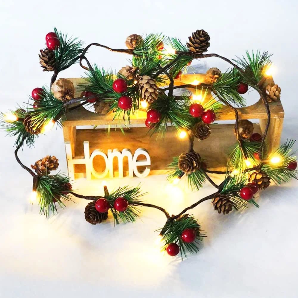 Ghirlanda Luminosa Natalizia 2 Metri con 20 MicroLED Luce Calda – Decorazione con Pigne, Bacche Rosse e Rametti di Pino – Funzionamento a Batterie