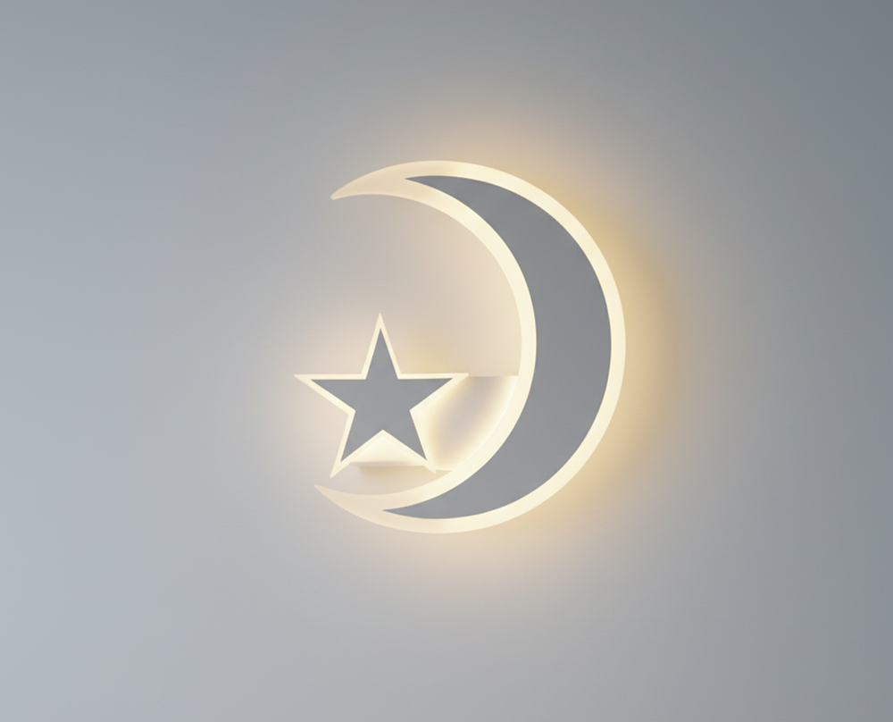 Realizzata in alluminio e acrilico bianco, presenta una forma elegante a mezzaluna con stella integrata, dove la luce LED delinea i contorni creando un effetto soffuso e accogliente.