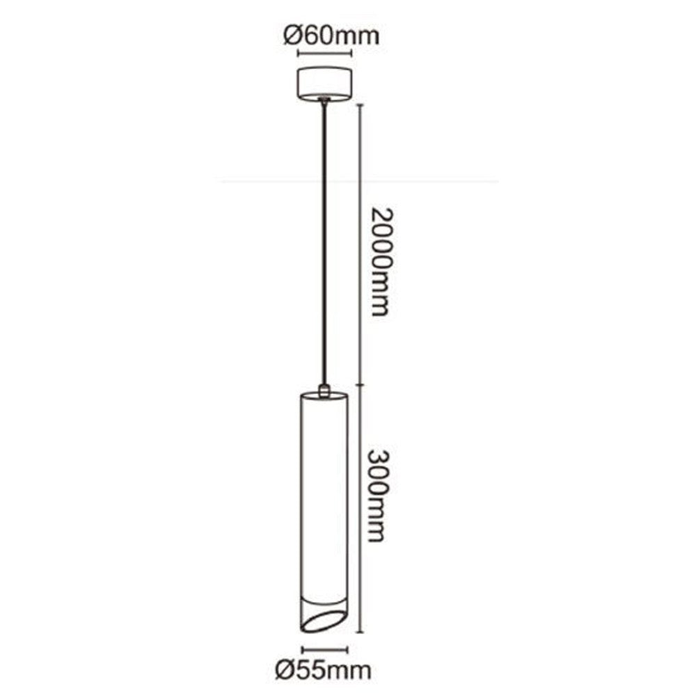 Dimensioni ottimizzate; corpo lampada Ø 55 mm x altezza 300 mm, rosone Ø 60 mm, cavo regolabile fino a 2000 mm