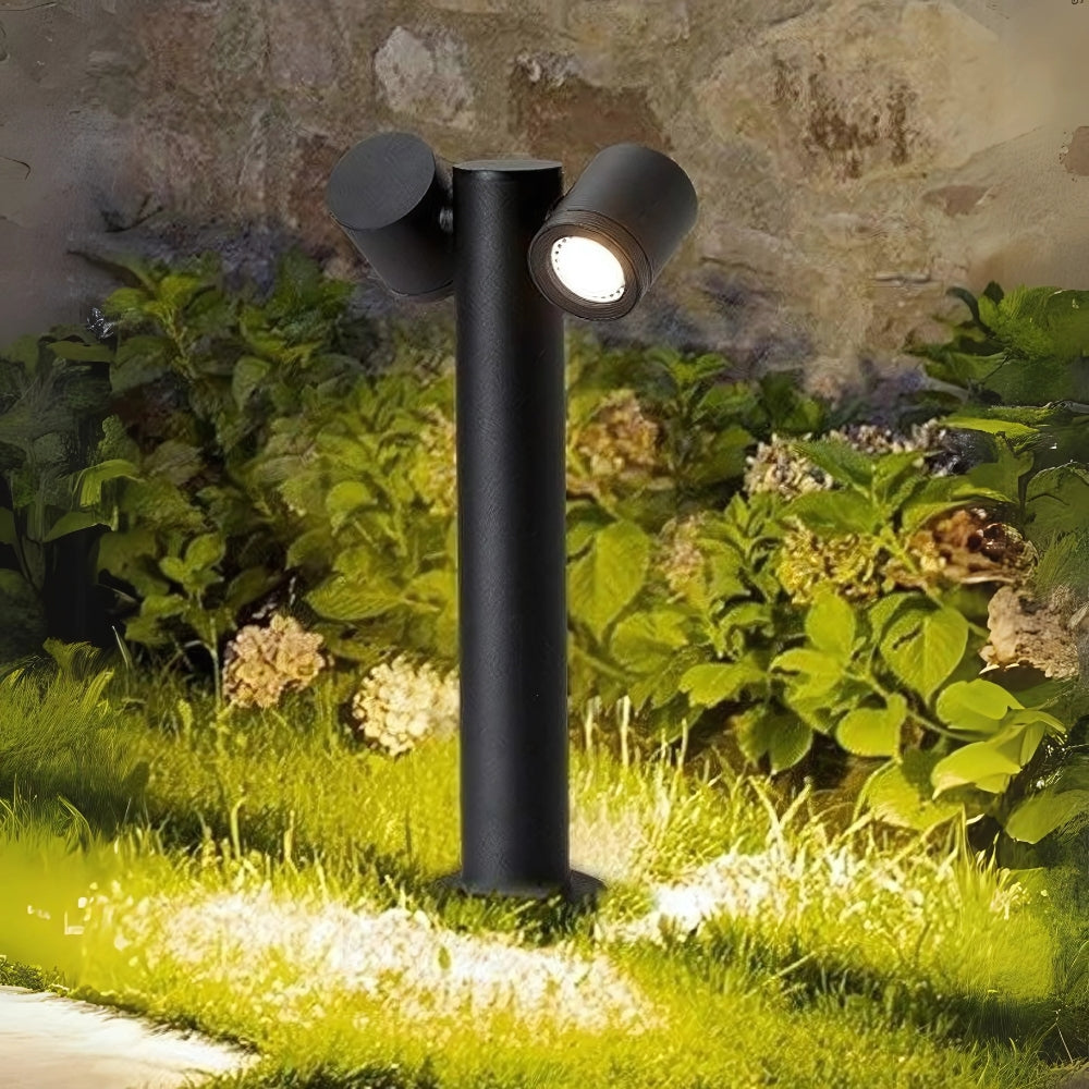 Design moderno e funzionale – Lampioncino da giardino con struttura in metallo grigio scuro e doppio faretto orientabile per un’illuminazione personalizzata.