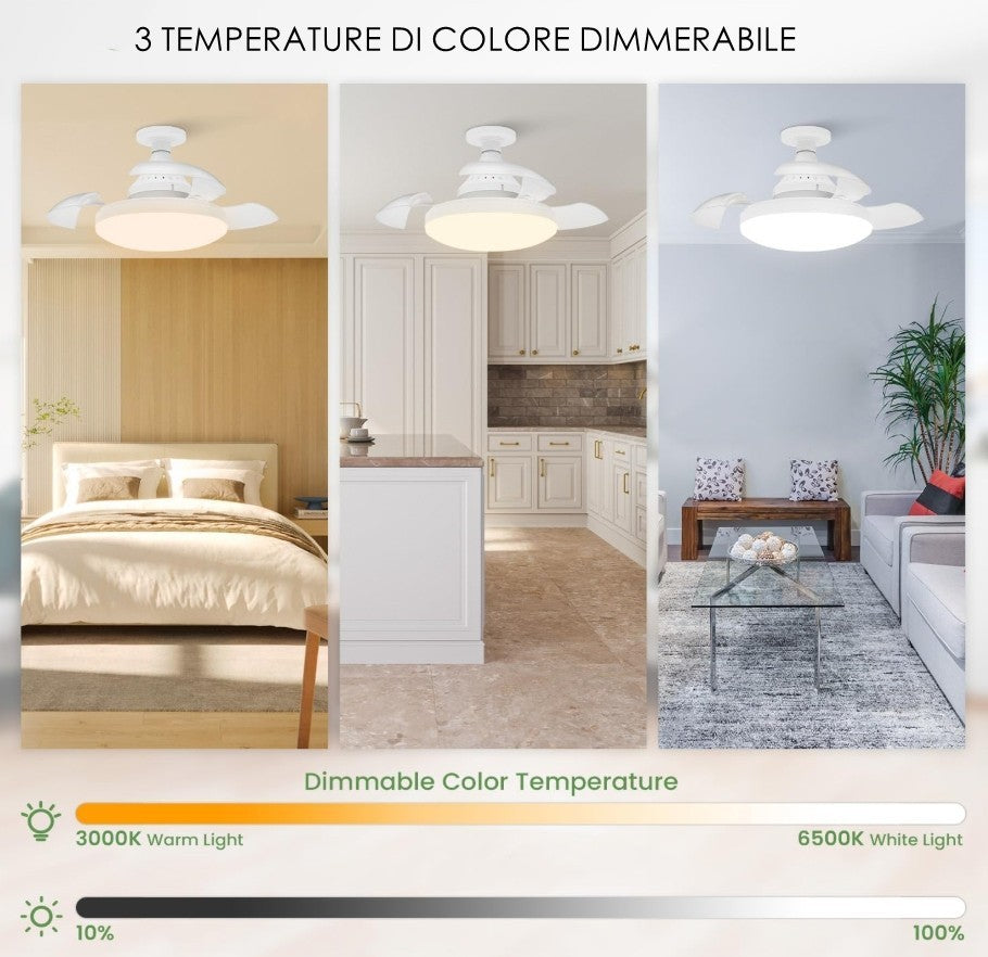 La luce LED, con un flusso di 1155 lumen e fascio da 120°, è regolabile in 3 temperature colore (3000K calda, 4000K naturale, 6500K fredda) e dimmerabile per adattarsi a ogni situazione. Il ventilatore integrato, da 10W, è dotato di 3 pale trasparenti e motore AC a 3 velocità silenziose, ideale per rinfrescare senza rumori fastidiosi.