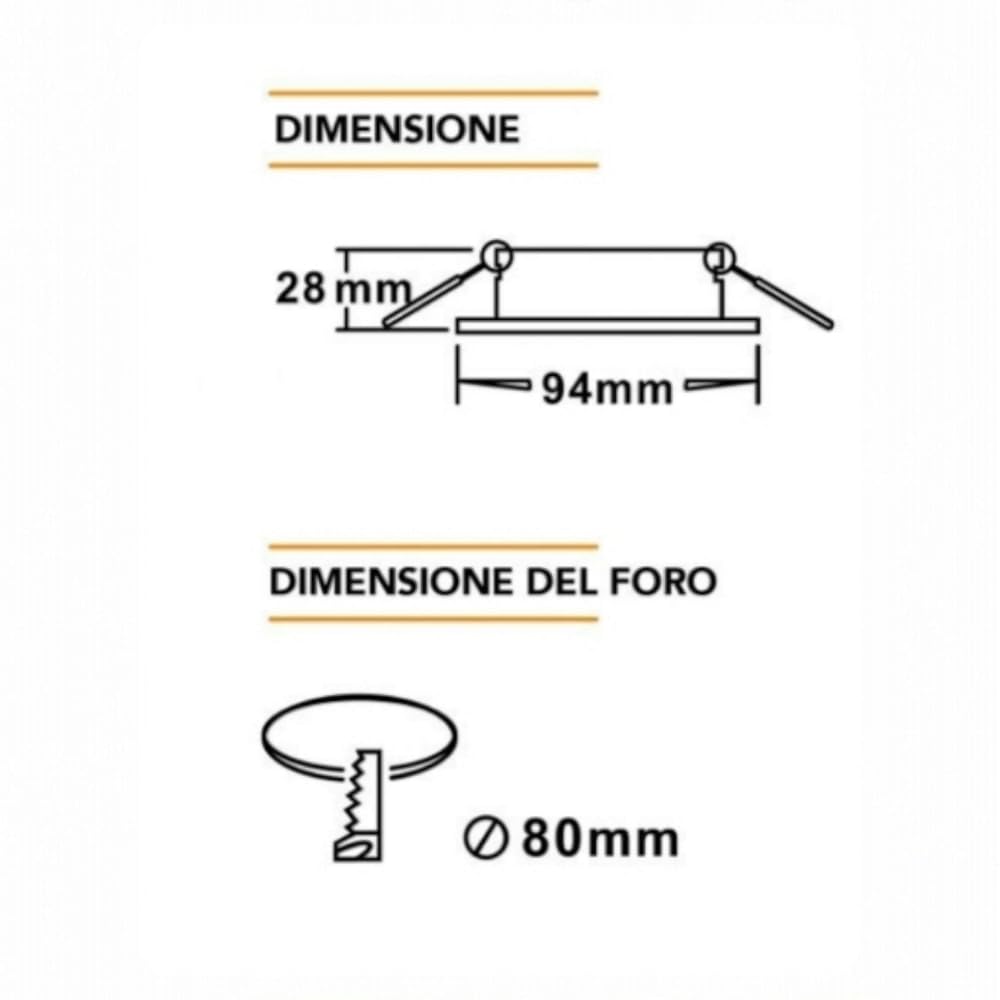 - DIMENSIONI OTTIMALI PER INCASSO – Foro di montaggio Ø80mm, diametro esterno 94mm, profondità 28mm; perfetto per installazioni a filo soffitto.