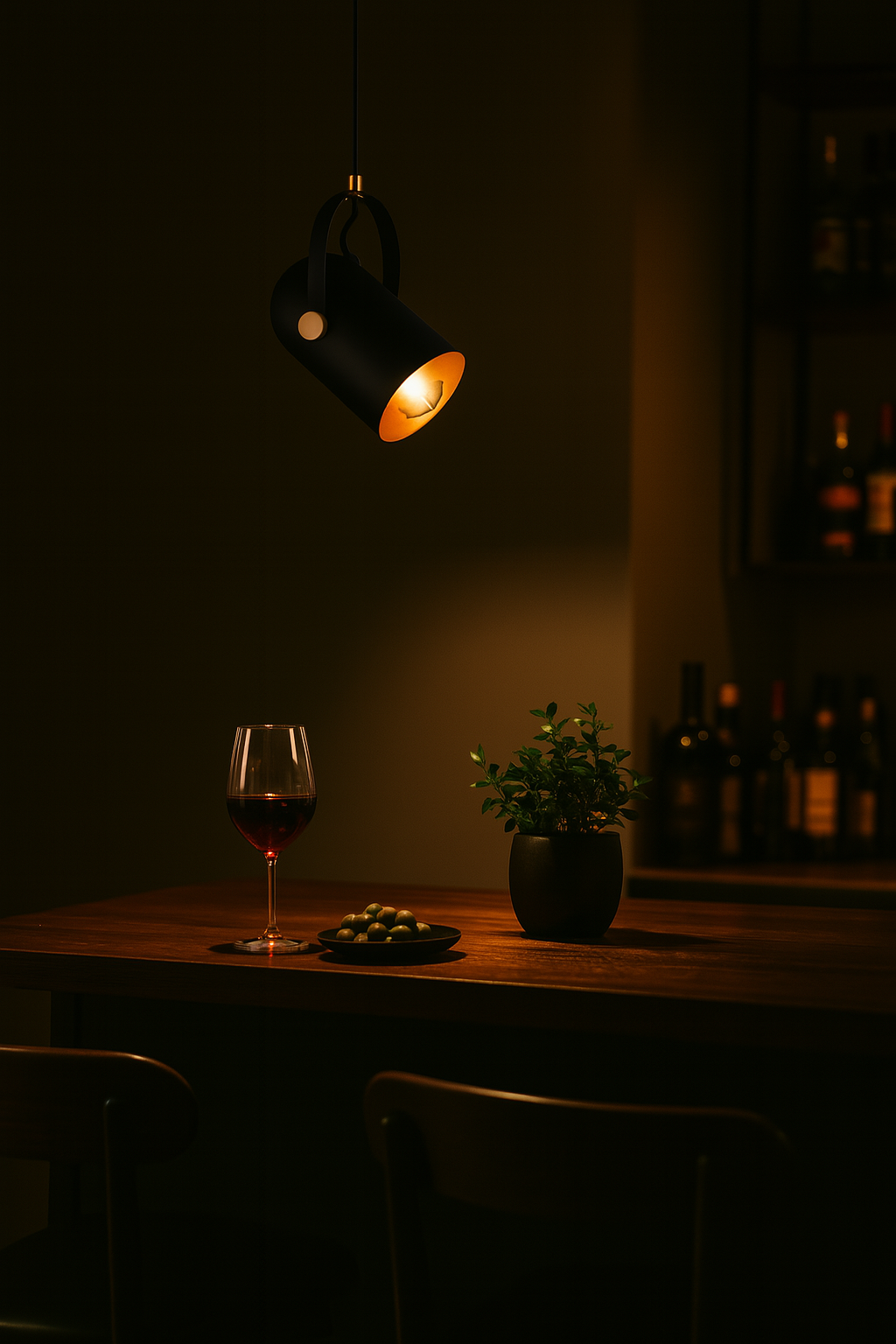 Il corpo cilindrico orientabile consente di dirigere la luce dove serve, rendendola ideale per isole cucina, tavoli da pranzo, banconi o soggiorni dal gusto contemporaneo.